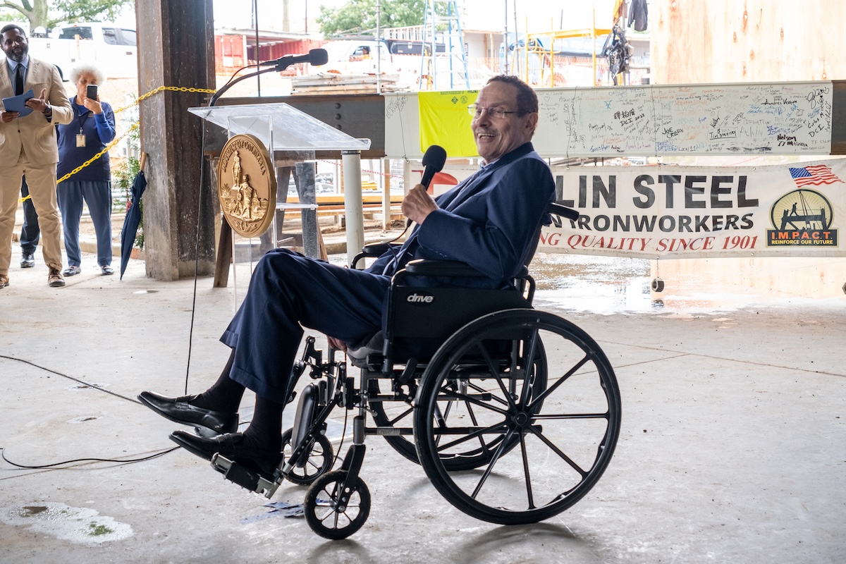 Washington Commanders franchise legend Darrell Green speaks during an Oct. 19 in Washington, D.C.'s Franklin Park at which Mayor Muriel Bowser (left) presented him with a ceremonial key to the city.