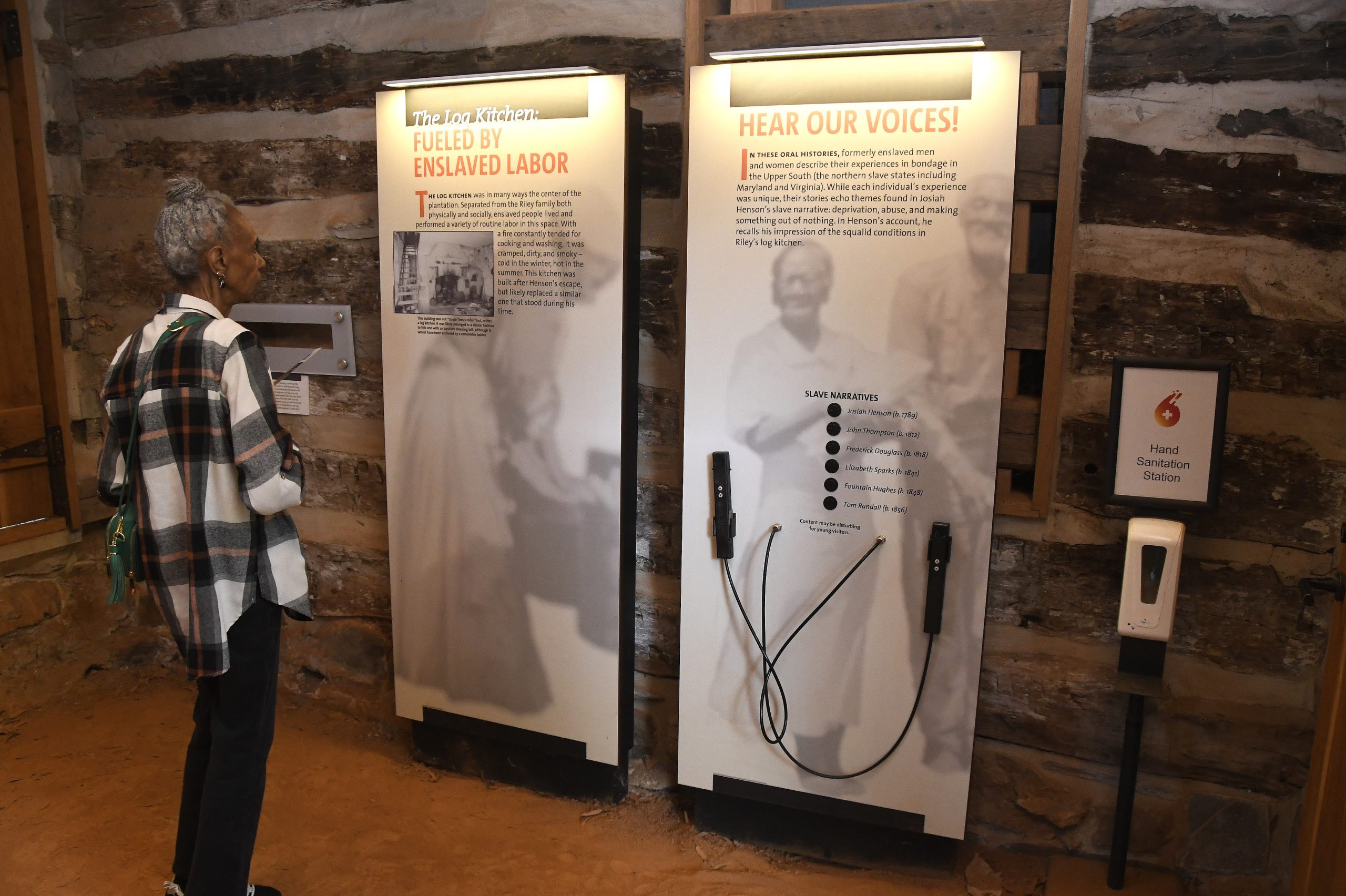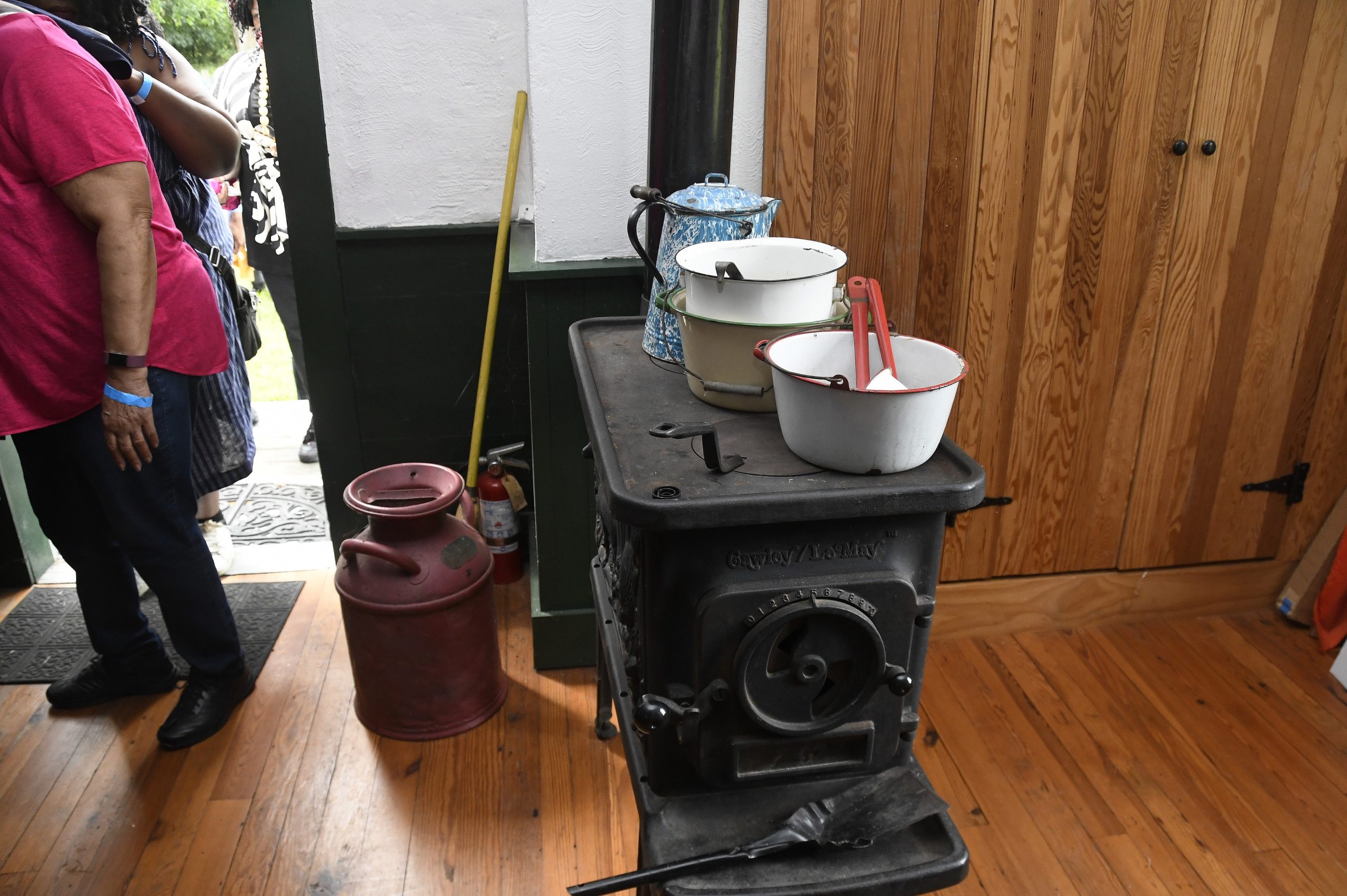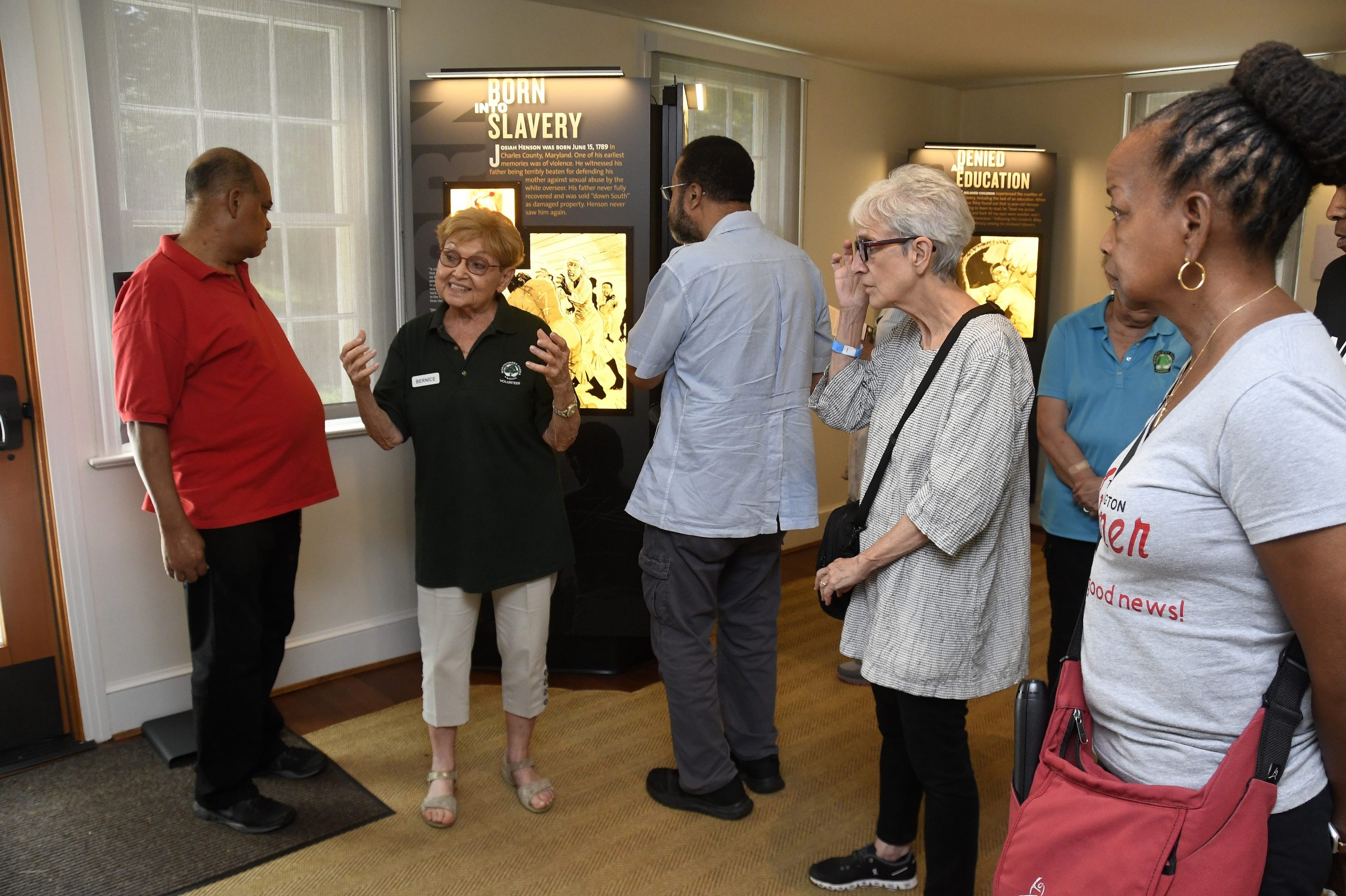 The tour stopped at the Josiah Henson Museum & Park in Rockville and received information about Henson’s life from the Museum’s docent, Mark Thorne. Visitors were given a tour of a slave kitchen that showed a bed area stowed above the stove. The kitchen included the original clay floor. The slave kitchen was attached to the big house.