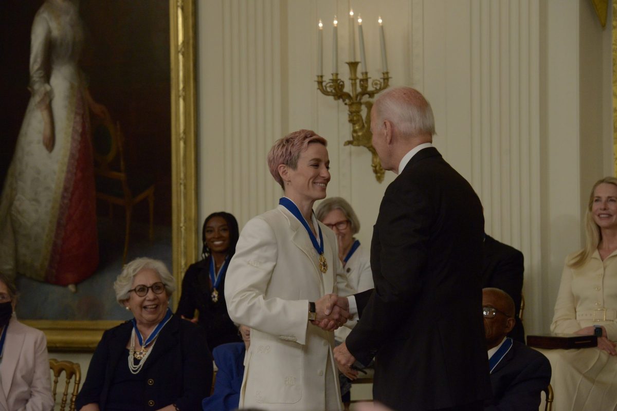 U.S. Women’s soccer team captain Megan Rapinoe took her shot as one of 17 Americans awarded the Presidential Medal of Freedom at the White House to call attention to the detention of Brittney Griner. The Olympic gold medalist and equal pay activist wore her feelings on her lapel- demanding fellow Olympic athlete and WNBA star, Brittney Griner, be brought out of detention in Russia.