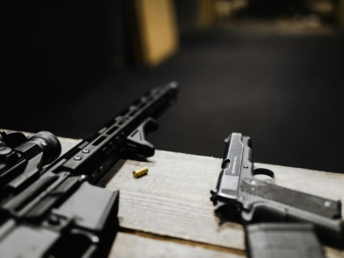 a rifle and a handgun on a desk